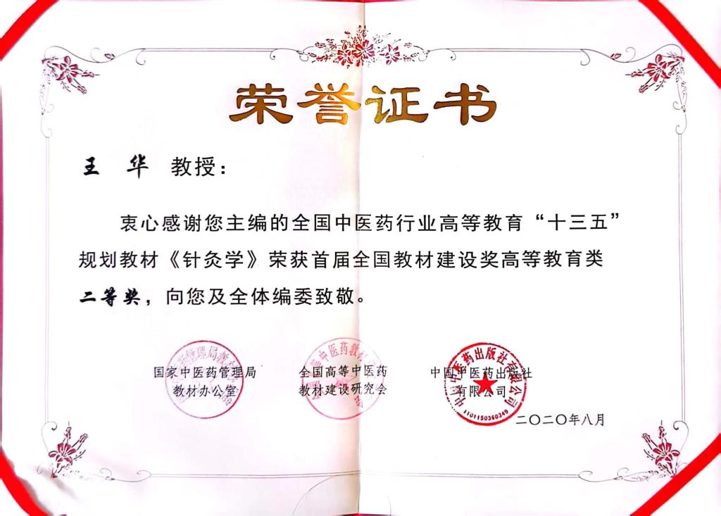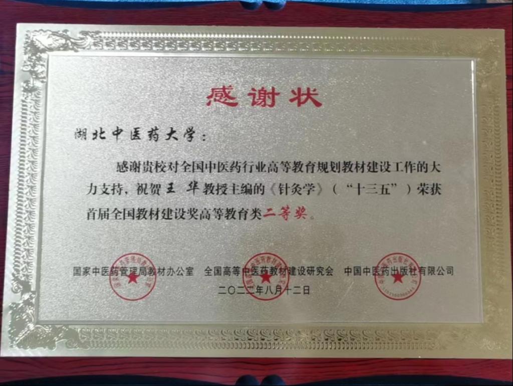 近期,由国家中医药管理局教材办公室、全国高等中医药教材建设研究会、中国中医药出版社联合组织的2021年首届全国教材建设奖表彰会在哈尔滨召开,由我校王华教授主编的《针灸学(新世纪第四版)》荣获全国优秀教材(高等教育类)二等奖。