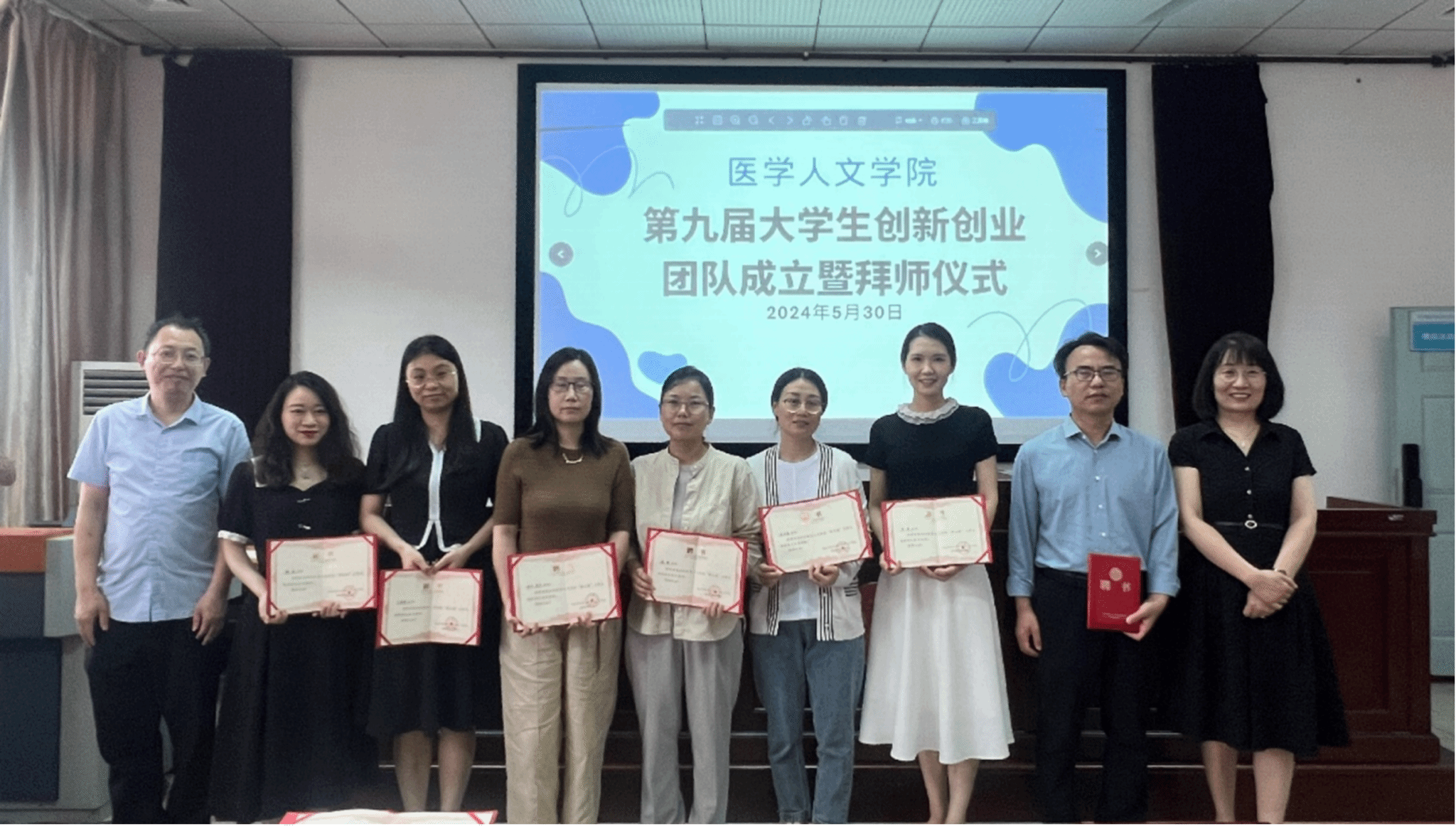 为营造浓厚的创新创业氛围,提高学生创新创业能力,5月30日,医学人文学院在黄家湖校区文华楼模拟法庭会议室举行第九届大学生创新团队成立暨拜师仪式。学院领导班子、20名指导老师和40多名新成员代表参加活动。