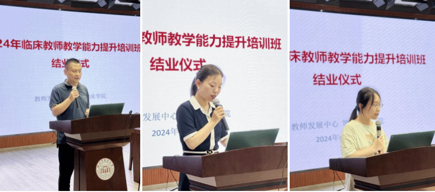 结业仪式上,第一临床学院参训教师代表发言,分享学习体会。实验诊断教研室倪维老师说,在培训中学到了许多先进教学技能和方法,深刻体会到了数字技术和课程思政在教学中的重要作用。针灸学临床教研室王洁钰老师表示,此次培训加深了自己对如何成为一名真正能够引导和激发学生潜能教师的深刻理解。超声诊断教研室毛雁翎老师说,教师不仅要教好书,传授专业知识,更要言传身教,培养学生高尚的情操和良好的医德。