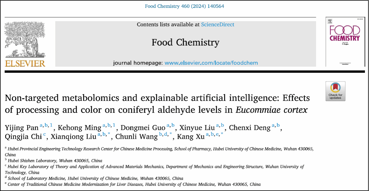 近日,药学院许康教授、检验学院王春莉副教授科研团队在高水平期刊Food Chemistry(IF:8.5,中科院1区)上发表的题为“Non-targeted metabolomics and explainable artificial intelligence: Effects of processing and color on coniferyl aldehyde levels in Eucommiae cortex”的研究成果。该成果采用非靶向代谢组学和可解释人工智能技术,成功解析了杜仲姜炙前后成分变化规律。研究将AI人工智能与中药炮制研究深度融合,是基于医工融合的中药炮制创新研究的标志性成果。许康教授、王春莉副教授为论文通讯作者,药学院刘先琼副教授为论文共同通讯作者,药学院硕士研究生潘亦靖为论文第一作者。湖北中医药大学、湖北时珍实验室为论文第一单位、通讯单位。