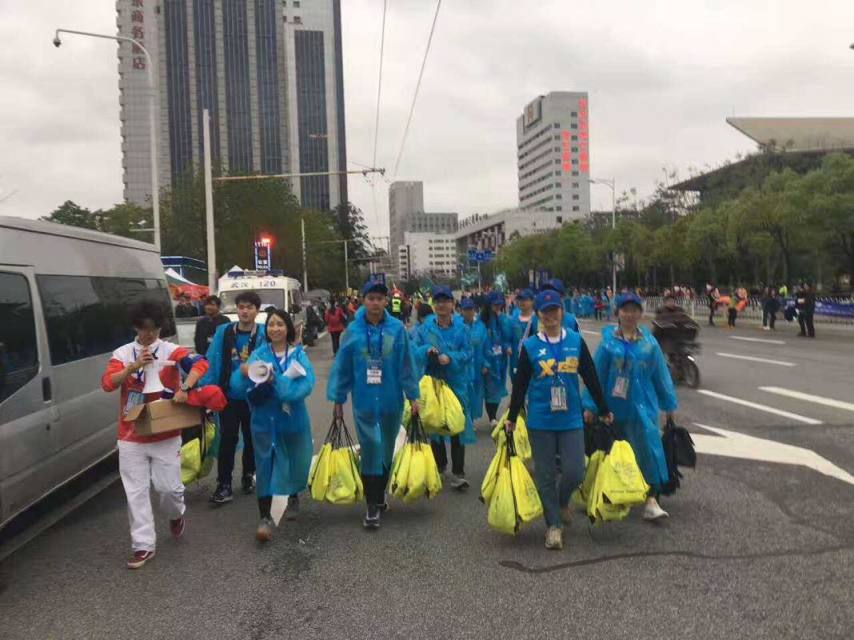本网讯 4月9日,由中国田径协会、湖北省体育局、武汉市人民政府主办的第二届武汉马拉松在江滩鸣枪开跑。本届马拉松共有来自29个国家和地区的2.2万名中外选手同场竞技,5264名志愿者驻守在20余个点位提供志愿服务。我校512名志愿者负责13公里跑终点路程分界指引、冲刺引导、物品发放以及17.5公里喷雾站、饮用食品站的志愿服务工作,服务人数占大赛总志愿者人数十分之一,为武汉市高校之最。同学们在风雨中连续工作7个小时,为近万名参赛者提供服务,受到大赛组委会和参赛选手高度认可,展示着中医学子自发自觉服务社会的强烈责任感与火热激情。