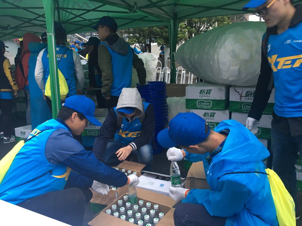 5点20分,抵达“汉马”服务站点后,大家迅速行动,积极调配人员和物资。负责食品站工作的志愿者们将供给食物分类摆放好;物品发放处的志愿者们将矿泉水运送到每一处分发台,并贴心地将每瓶矿泉水拧开,方便参赛者领取饮用。