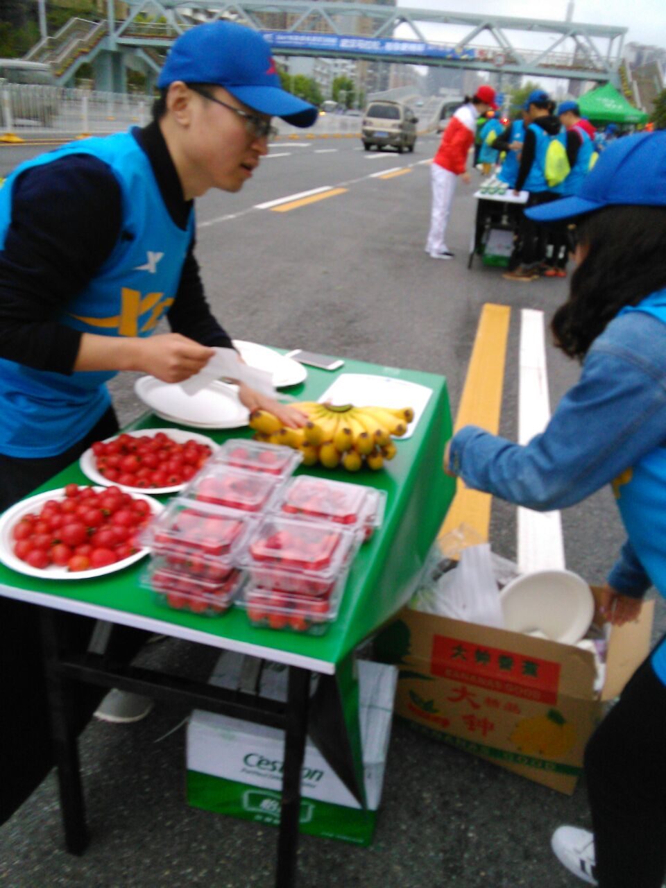 负责食品站工作的曹雪婧等四名志愿者正在迅速摆放食物:“对于这次活动,我们每个人心里都有一份使命感,希望能为选手提供最贴心的服务。”