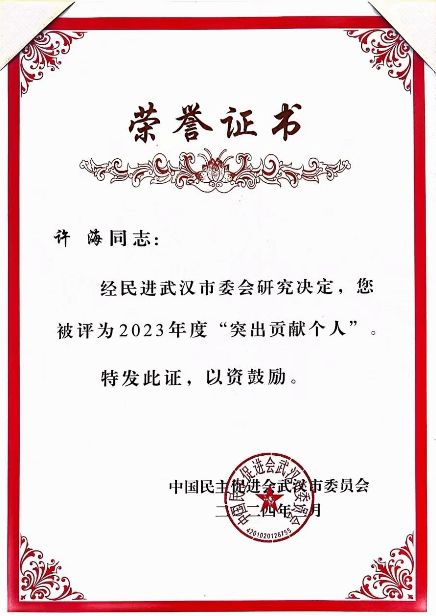 3月22日,民进武汉市委会在市民主党派大楼召开学习贯彻全国两会精神暨主题教育总结会,中共武汉市委统战部副部长、市社会主义学院党组书记王磊应邀出席会议。会议宣读民进武汉市委会2023年度表彰决定,武汉市妇女儿童专委会副主任、市名医公益团秘书长、洪山区工委委员、我校黄家湖医院主任医师许海同志被授予2023年度“突出贡献个人”荣誉称号。