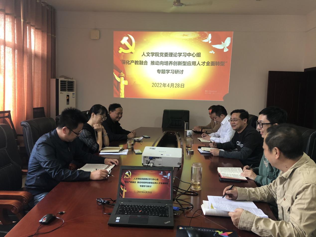 2022年4月28日,人文学院学院党委理论学习中心组在立言楼B505室开展“深化产教融合 推动向培养创新型应用人才全面转型”专题集中学习,集中学习由曾志东书记主持,全体党委委员和党政办负责同志参加了本次集中学习。