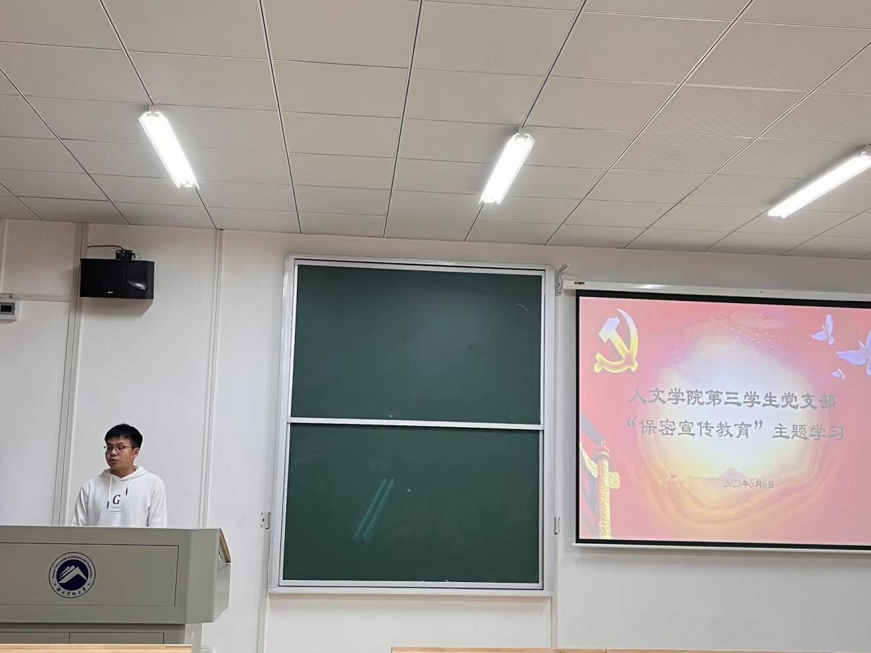 5月6日,人文学院研究生第三党支部在昭潭书院校区2教301教室开展“坚持和加强党的领导”及“保密宣传教育”主题学习活动。