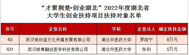 本网讯 近日,湖北省人力资源与社会保障厅、湖北省教育厅、共青团湖北省委员会公布“才聚荆楚·创业湖北”2022年度湖北省大学生创业扶持项目拟扶持项目名单,学校两项创业项目入选,共获批扶持资金13万元。其中,检验学院罗翊宁同学申报的《武汉纸坊造文化传播发展有限公司》项目获得8万元的扶持金额,基础医学院张利同学申报的《武汉岐黄融创医学科技有限公司》项目获得5万元的扶持金额。此次扶持资金是历年来学校创新创业类项目获批的最高金额。
