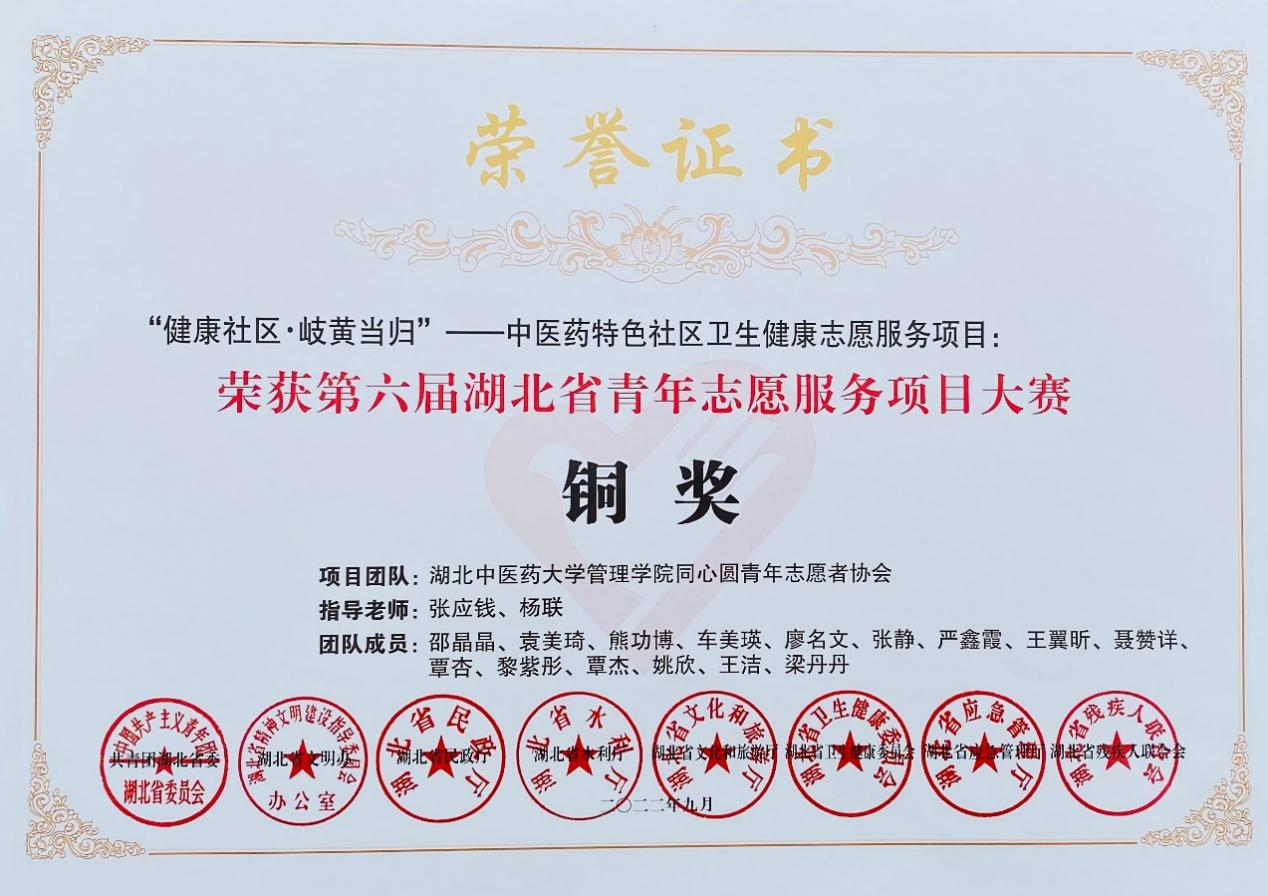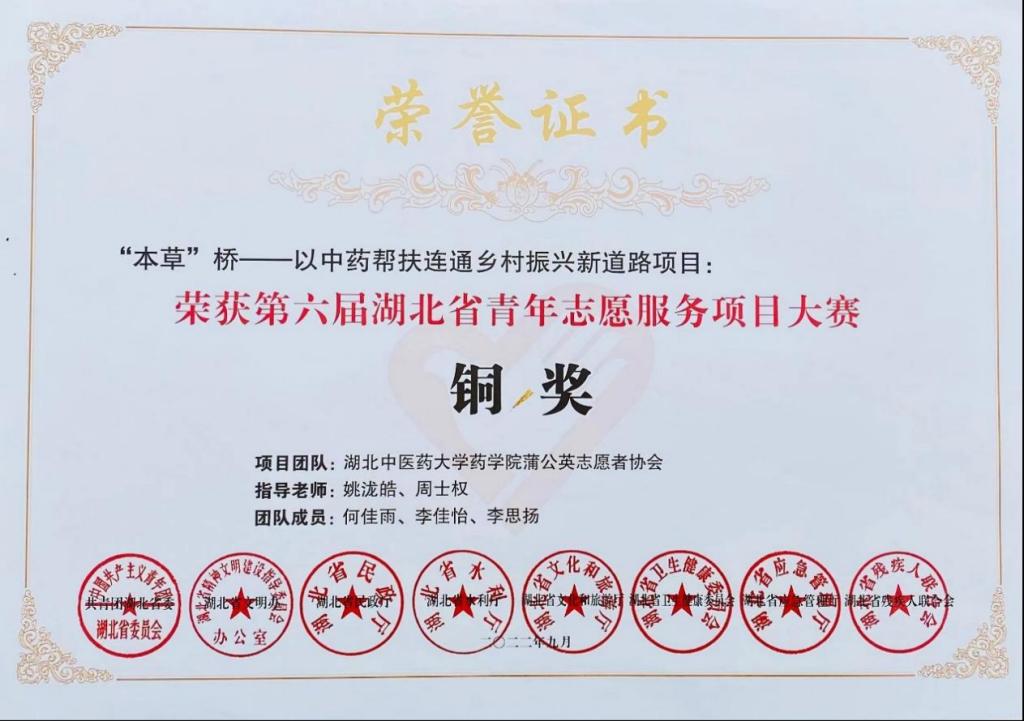 本网讯 近日,共青团湖北省、湖北省志愿者协会公布了第六届湖北省青年志愿服务项目大赛评选结果,我校药学院“‘本草’桥——以中药帮扶连通乡村振兴新道路”项目、管理学院“健康社区·岐黄当归——中医药特色卫生健康志愿服务”项目获大赛铜奖。