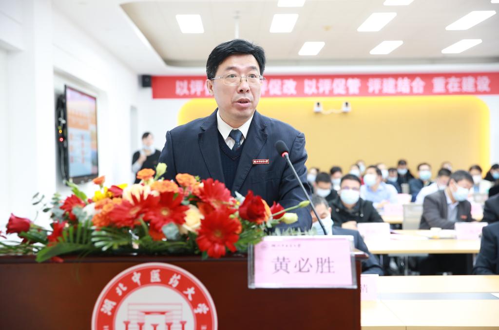 我校中药学专业负责人、副校长黄必胜从学校概况、中药学专业发展与特色、中药学专业建设水平、存在的不足与改进方向四个方面,对学校中药学专业建设情况作了汇报。