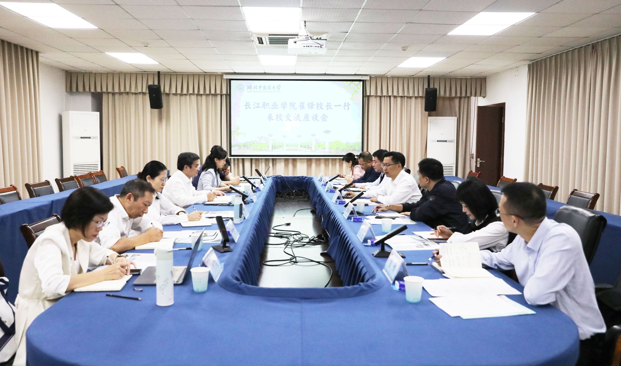 本网讯 9月25日,长江职业学院校长崔锋,党委委员、纪委书记张术平等一行来校交流座谈。党委书记、湖北时珍实验室常务副主任刘松林主持会议,党委常委宋杰,党政办公室、教务处、科学技术发展研究院、药学院、护理学院等单位相关负责人参加座谈。