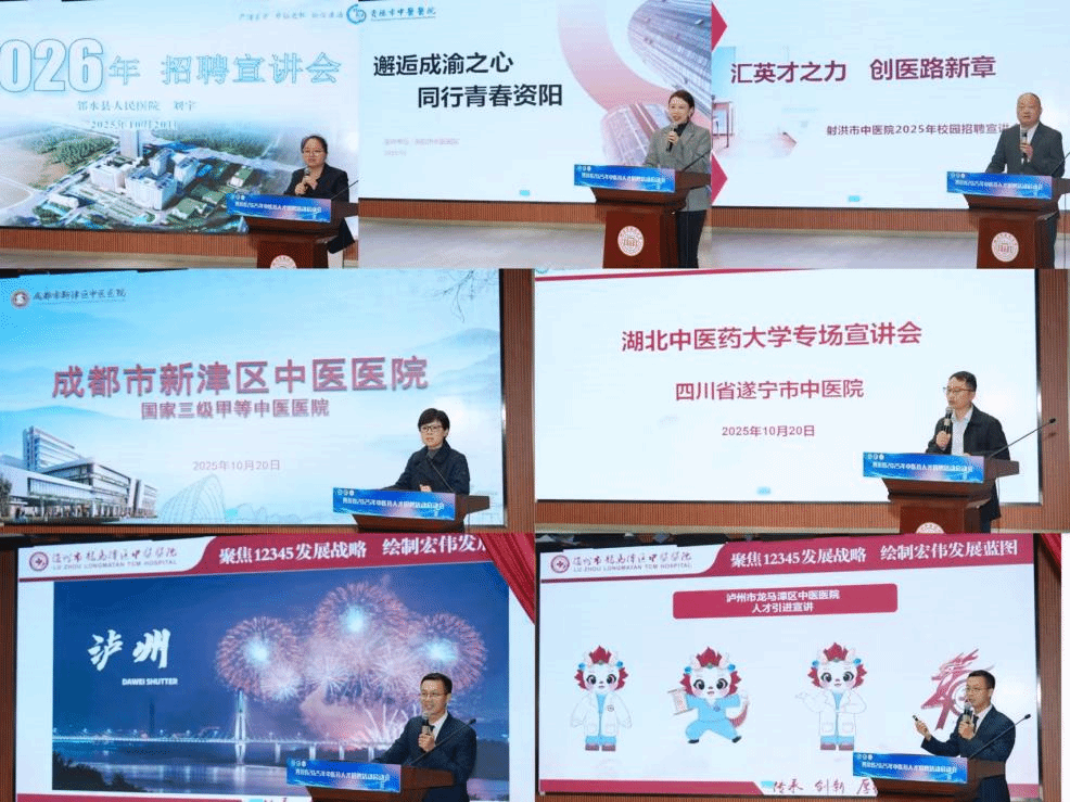 在专场宣讲环节,遂宁市中医院、资阳市中医医院等7家医疗单位围绕医院概况、岗位需求与人才政策进行了推介宣讲。宣讲结束后,各医院代表在指定咨询点与毕业生进行一对一交流,同学们积极投递简历,主动咨询岗位信息,现场互动气氛热烈。