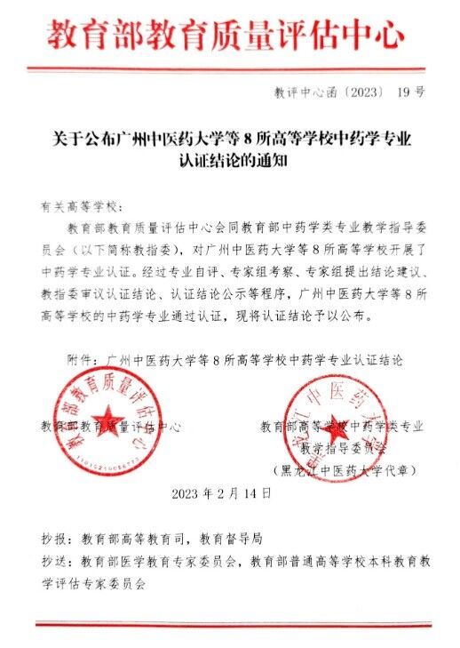 本网讯 近日,教育部教育质量评估中心发布《关于公布广州中医药大学等8所高等学校中药学专业认证结论的通知》(教评中心函〔2023〕19号),我校中药学专业通过教育部认证,有效期6年,即至2028年12月。