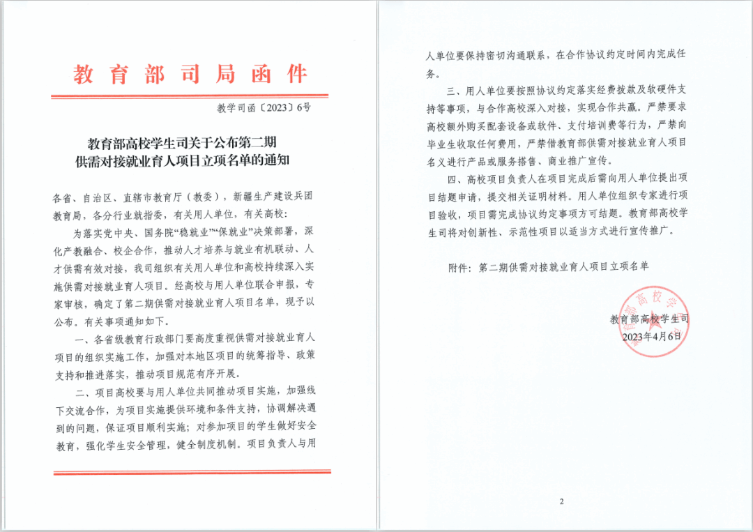 教育部高校学生司供需对接就业育人项目是落实党中央、国务院“稳就业”“保就业”决策部署的一项重要举措,旨在进一步深化产教融合、校企合作,推动人才培养与就业有机联动、人才供需有效对接。此次供需对接就业育人项目立项为学校深化人才培养模式改革、进一步探索就业育人路径开辟了更广阔的渠道。下一步,学生工作部毕业生就业指导中心将以就业育人项目实施为契机,加强项目过程管理,为项目实施提供有力支撑,协调督促项目负责人与用人单位保持密切联系,确保项目顺利实施,为毕业生提供更多专业对口的实习岗位和就业机会,提升毕业生就业能力,促进毕业生实现更充分更高质量就业。