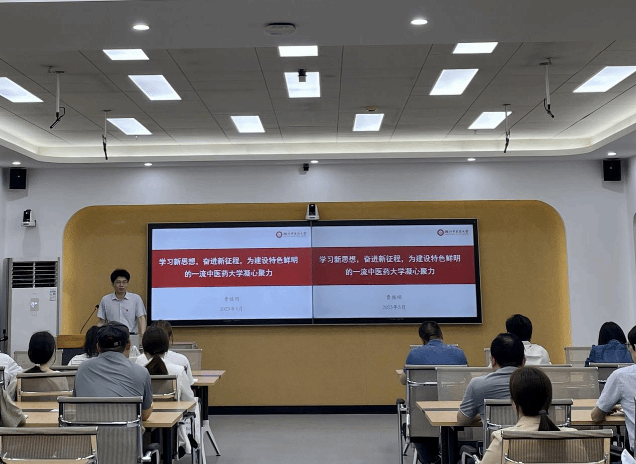 曹继刚以“学习习近平新时代中国特色社会主义思想,奋进新征程,为建设特色鲜明的一流中医药大学凝心聚力”为题,围绕开展主题教育的重大意义、总目标及具体要求,党的二十大报告精神,推动工作高质量发展,奋进新征程、建设特色鲜明的一流中医药大学等四个方面进行了讲解。