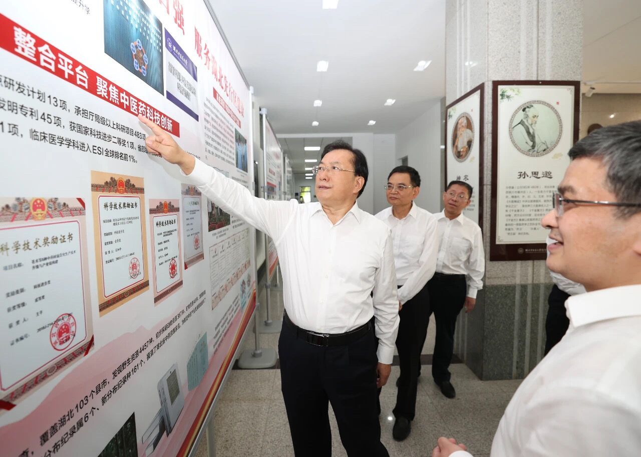 按照中央和省委关于开展主题教育、大兴调查研究的部署要求,6月8日,王忠林省长来校调研,听取学校服务人民健康、疫情防控等情况汇报,察看中药炮制加工、中药资源开发研究及应用成果展示。他指出,中医药是中华民族的瑰宝,湖北中医药大学要坚持传承精华、守正创新,围绕中医药全生命周期健康服务链条,聚焦中药材种业、种植和新药研发等重点领域,加大科研攻关力度,打造高水平中医药科技创新中心;提升建设管理水平,引育高层次人才,充分发挥名医大师传帮带作用,加快建设知名专科、学科和中医院校;大力传承优秀中医药文化,加强养生保健科学知识普及,增强群众卫生健康意识,实现从注重“治已病”向注重“治未病”转变,更好增进人民群众健康福祉。