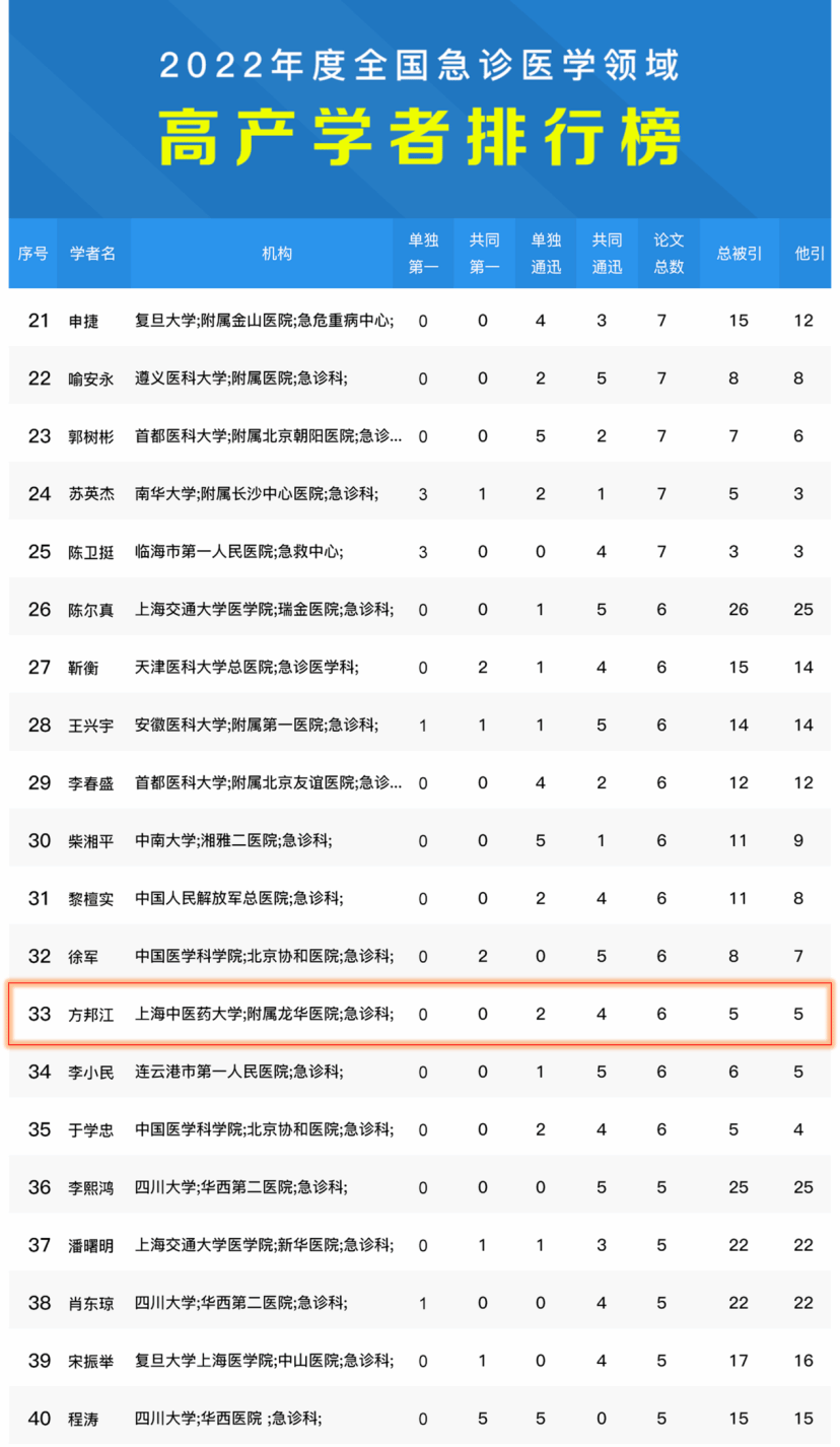 我校杰出校友方邦江教授入选“2022年度全国急诊医学领域高产学者排行榜”
