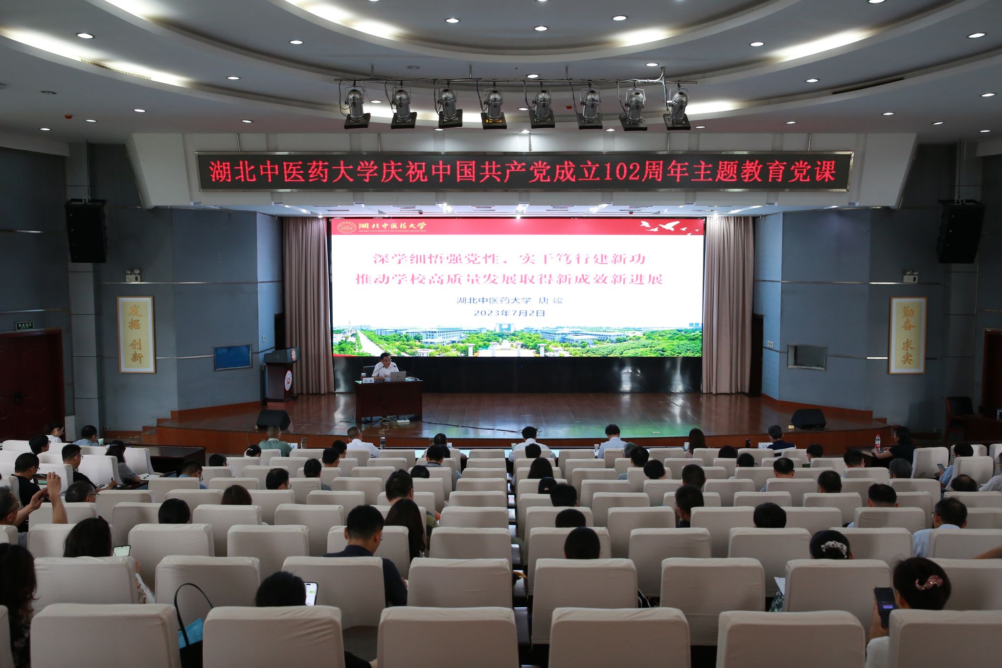 本网讯 7月2日,在庆祝中国共产党成立102周年之际,为进一步推动学习贯彻习近平新时代中国特色社会主义思想主题教育走深走实,校党委书记唐峻在黄家湖校区明德楼学术报告厅讲授主题教育专题党课。全体在校校领导、中层干部参加学习。
