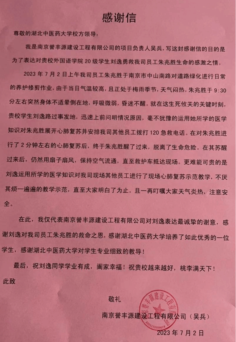 外国语学院相关负责人介绍,学院注重思想引领和专业教育相结合,鼓励学生积极开展医学专业知识学习与志愿服务活动。刘逸的义举,彰显了我校学子的责任担当,传递着满满正能量。