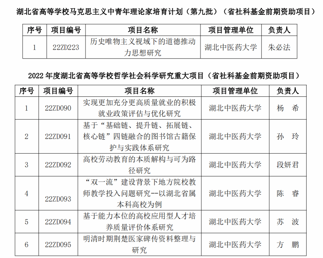 本网讯 近日,湖北省教育厅、湖北省哲学社会科学工作领导小组办公室联合发文,公布《湖北省高等学校马克思主义中青年理论家培育计划(第九批)(省社科基金前期资助项目)》《2022年度湖北省高等学校哲学社会科学研究重大项目(省社科基金前期资助项目)》,我校入选湖北省高等学校马克思主义中青年理论家培育计划 (第九批)1项,获批湖北省高等学校哲学社会科学研究重大项目6项。2022年,我校获省社科基金项目立项共12项,为历年新高。