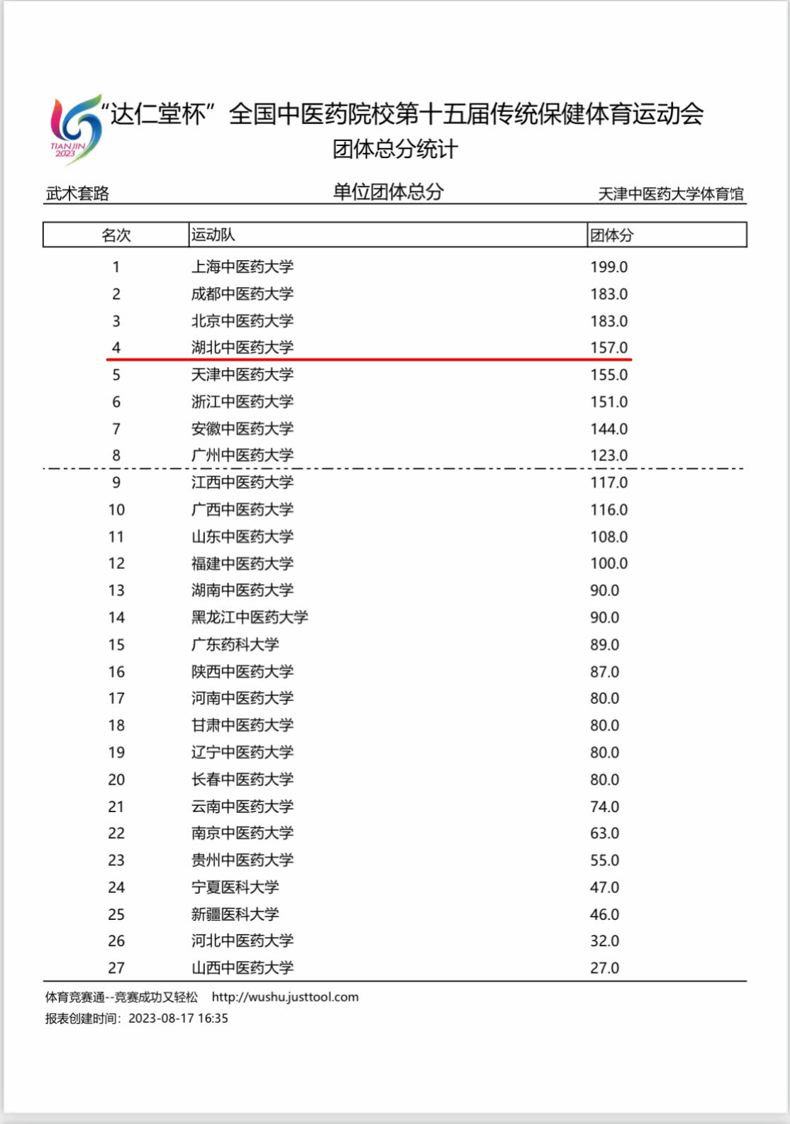 全国中医药院校传统保健体育运动会是面向全国中医药院校举办的具有鲜明中华民族传统文化特色的规模最大、规格最高的体育赛事,是促进中医药院校交流、传递友谊的体育赛事。本届运动会竞赛项目分为传统保健项目、集体项目和武术项目3大类,下设五禽戏、八段锦、太极拳、长拳、南拳、刀、剑、棍等31个小项。通过比赛,我校向全国各兄弟院校展示了湖北中医药大学学子的精神风貌。今后,校武术队将继续拼搏奋进,弘扬中华武术自强不息精神,争取在全国大赛中再创佳绩。