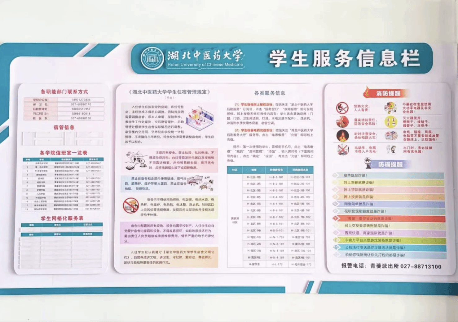 各学生宿舍一楼大厅统一设计悬挂学生服务信息栏