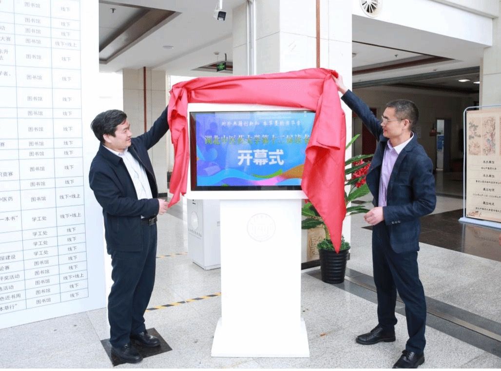 本网讯 4月18日,在第29个世界读书日到来之际,学校举行“时珍典籍创新知 本草墨韵书华章”第十二届读书节开幕式。校长刘松林、副校长杨波为读书节开幕式揭幕,学校办公室、党委组织部、学生工作部、校团委以及各学院相关负责人、学生代表、图书馆全体馆员参加开幕式。