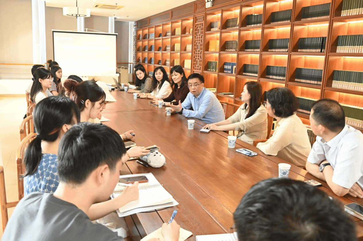 本网讯 为进一步推动中医药对外传播交流,讲好中医药故事,5月7日,学校中医药国际传播研究中心在黄家湖校区图书馆东壁斋举办“湖畔中医青年讲堂”学术交流座谈会,邀请外文出版社党委书记、社长胡开敏、外文出版社首席编辑、编辑部主任蔡莉莉交流分享。外国语学院负责人、相关负责人、师生代表参加座谈会。