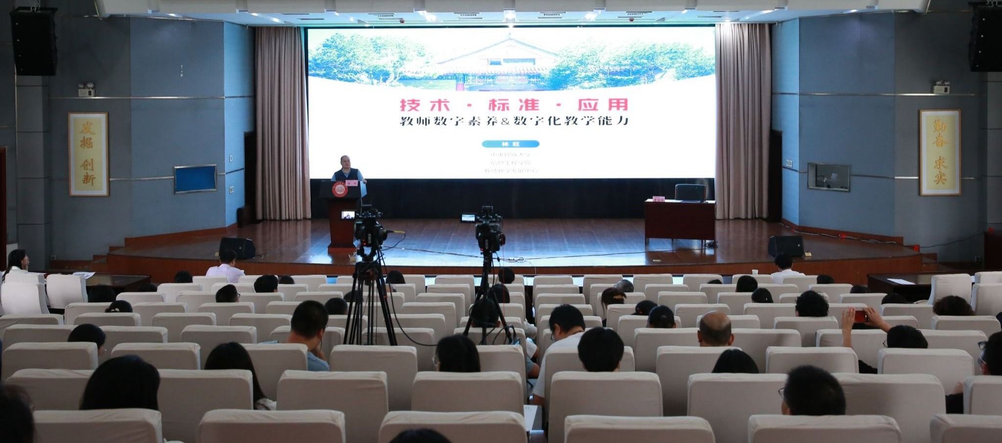 本网讯 5月31日,学校在黄家湖校区明德楼学术报告厅举行教师数字素养培训首场报告会,特邀中央民族大学林旺教授作报告。报告会以线下与线上同步直播的方式进行。校党委常委曹继刚主持报告会,各单位负责人及教师代表150余人参加现场活动,百余名教师同步参加线上学习。