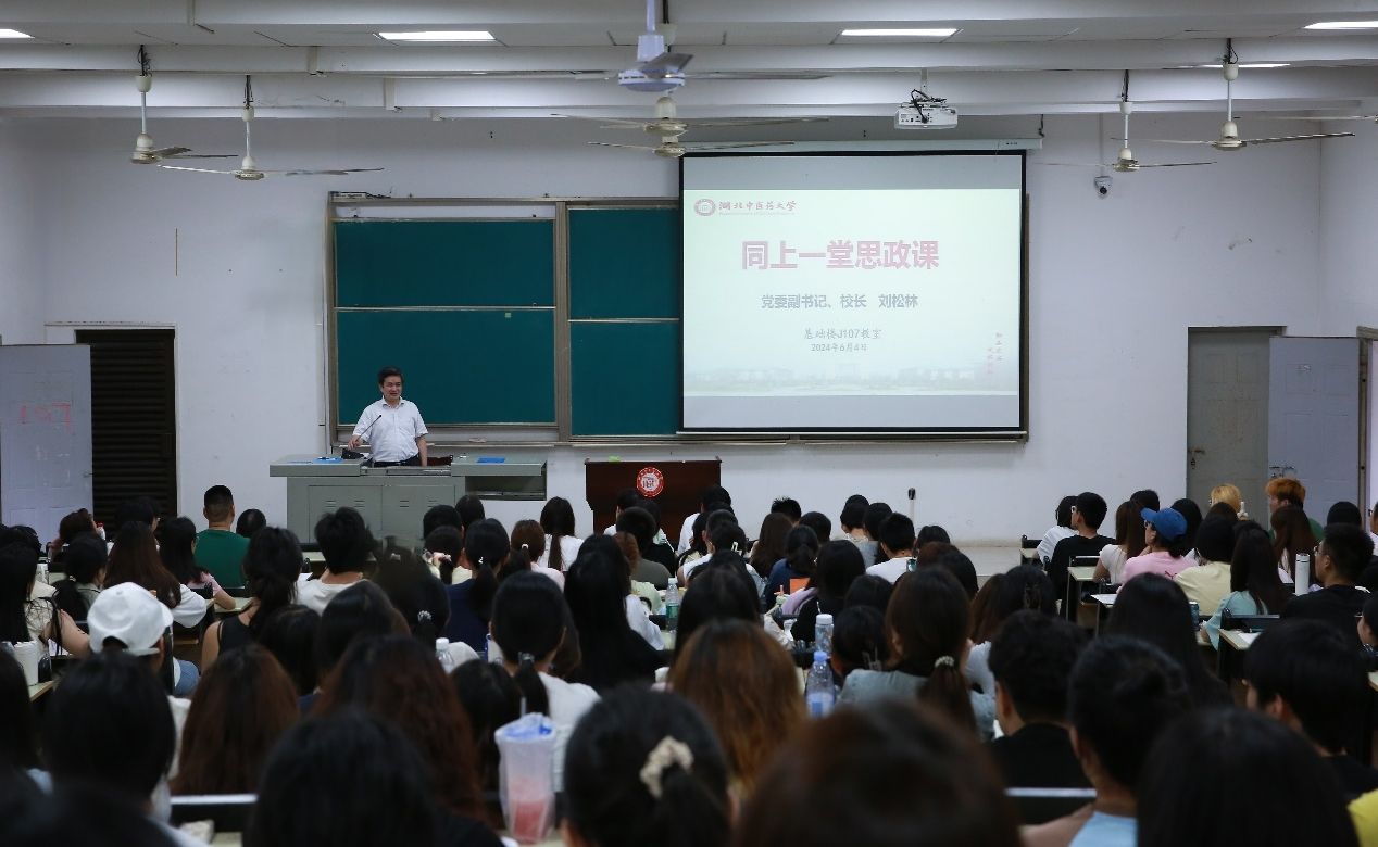 本网讯 为深入学习贯彻习近平总书记对学校思政课建设作出的重要指示精神,充分发挥新时代伟大成就的教育激励作用,引导学生感悟党的创新理论的实践伟力,6月4日,校长刘松林深入教学一线,走进思政课堂,以“读懂中国式现代化”为主题,在黄家湖校区杏林阁J107教室为2023级中医学、助产学和医学影像技术专业学生讲授了一堂生动的思政课。