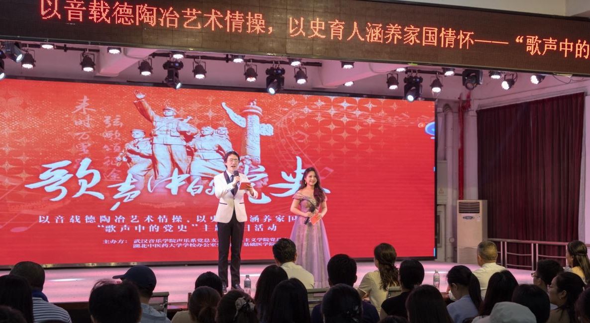 本网讯 为巩固拓展学习贯彻习近平新时代中国特色社会主义思想主题教育成果,扎实推进“学习提能促发展”“正风提效抓落实”活动,引导广大师生党员特别是毕业生党员进一步深入学习党史知识,传承红色基因,6月6日,基础医学院党委、学校办公室党支部联合武汉音乐学院声乐系党总支、马克思主义学院党总支共同举办“以音载德陶冶艺术情操,以史育人涵养家国情怀——歌声中的党史”特色主题党日活动。校纪委书记、监察专员胡少萍,校党委统战部负责人,武汉音乐学院声乐系党总支、马克思主义学院党总支、学校办公室党支部和基础医学院党委师生党员代表200余人参加活动。