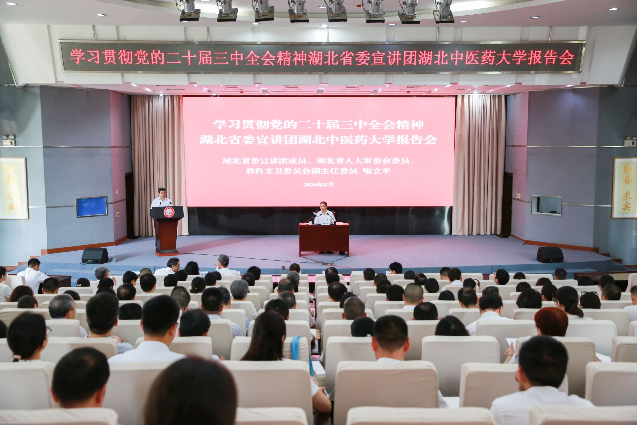 本网讯 8月30日,学习贯彻党的二十届三中全会精神湖北省委宣讲团湖北中医药大学报告会在黄家湖校区明德楼学术报告厅举行。湖北省委宣讲团成员、湖北省人大常委会委员、教科文卫委员会副主任委员喻立平受邀来校作宣讲报告,这也是学校2024年暑期高质量发展干部人才、党支部书记、专职辅导员素质能力提升专题培训班的辅导报告之一。党委书记、校长刘松林主持报告会。校领导、中层干部、高层次专家人才代表、党支部书记、专职辅导员、湖北时珍实验室工作人员参加报告会。