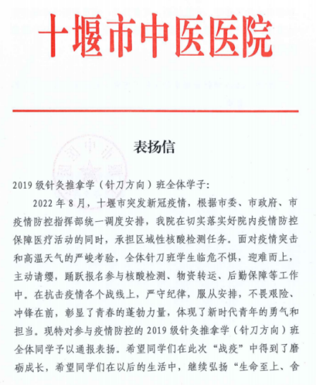 十堰市中医医院向针灸骨伤学院2019级针刀班发来感谢信