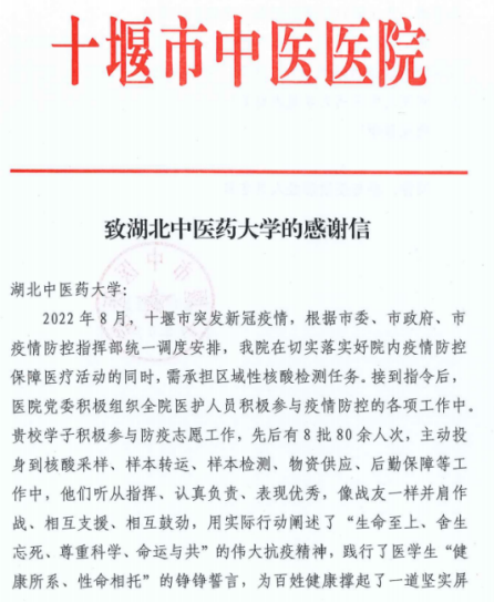 本网讯 近日,十堰市中医医院向学校及针灸骨伤学院2019级针刀班发来感谢信。信中提到:今年8月,十堰市突发新冠肺炎疫情,面对疫情突击和高温天气的严峻考验,在十堰市中医医院进行床边教学的2019级针刀班全体同学迎难而上,主动请缨,踊跃报名,彰显了青春的蓬勃力量,展现了新时代青年的勇气和担当。