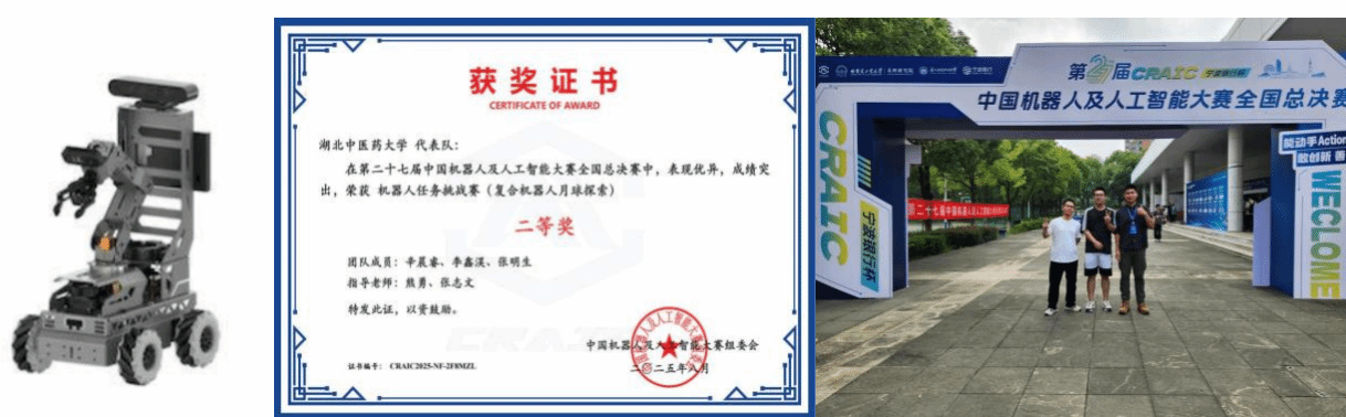 在第二十七届中国机器人及人工智能大赛全国总决赛中,由辛晨睿、李鑫淏、张明生同学(指导老师:熊勇、张志文)组成的参赛队伍凭借作品《roslander复合探索智能车》获机器人任务挑战赛(复合机器人月球探索)二等奖。该机器人采用铝合金机身,搭载Jetson Orin Nano和STM32控制器,配备5自由度机械臂及双3D相机,运行Ubuntu18.04+ROS系统,支持Python编程实现自主导航、动态避障及三维抓取,成功完成SLAM建图、导航、资源回收、坡度识别等任务。
