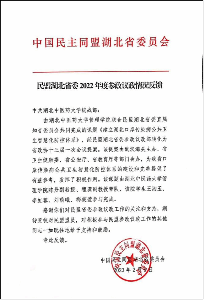 本网讯 近日,学校收到民盟湖北省委员会发来的2022年度参政议政情况反馈,对我校管理学院师生积极参与民盟参政议政工作表示感谢。