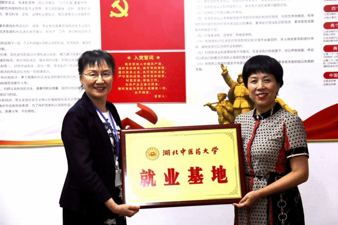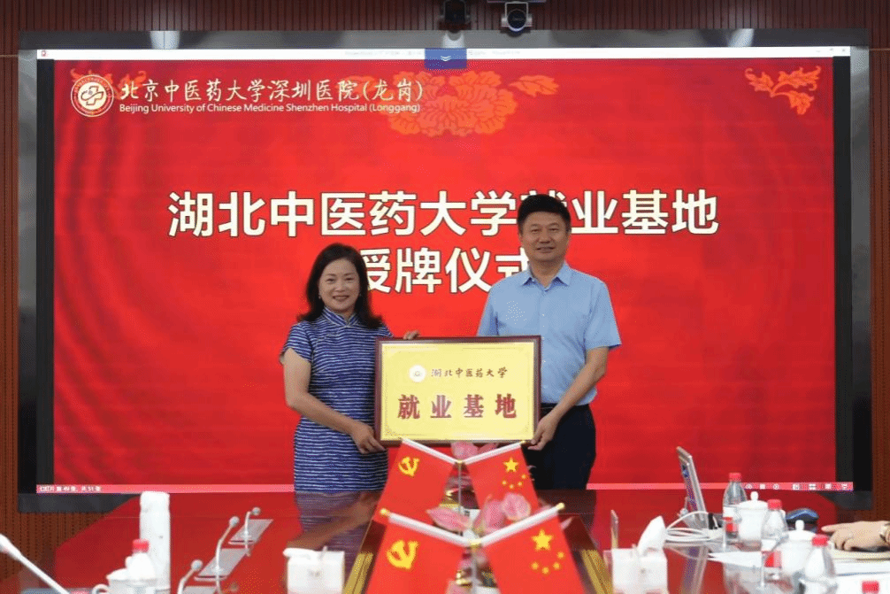 副校长马骏和北京中医药大学深圳医院党委书记胡世平为“湖北中医药大学就业基地”揭牌