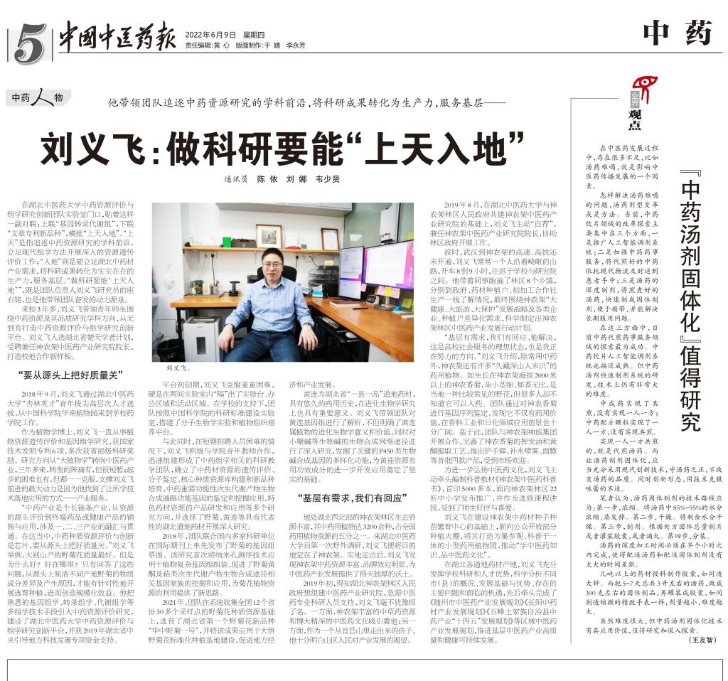 本网讯 6月9日,中国中医药报5版头条“中药人物”专栏以《刘义飞:做科研要能“上天入地”》为题,对我校药学院刘义飞研究员带领团队追逐中药资源研究的学科前沿,将科研成果转化为生产力,服务基层的奋进事迹作了详细报道。