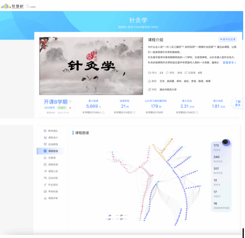 据悉,建成的首门知识图谱新形态共享课程《针灸学》上线智慧树平台,可供全国高校跨校共享。《针灸学》知识图谱新形态共享课程是在原有首批国家级一流本科课程(线上线下混合式)《针灸学》慕课的基础上升级建设而成,为双语版《针灸学》课程知识图谱,系统梳理了共计173个知识点、建构出240个知识点关系、教学资源317个、研究出61个问题体系,并结合专业培养方案梳理出3个主要的课程能力。通过应用人工智能技术和自然语言处理算法,将《针灸学》的各个知识点有机地联系起来,形成了完整的、多维度的知识网络。学生可根据个人喜好选择切换“树状”与“网状”查看知识图谱的展现形式,也可从某个问题切入,在“问题图谱”、“能力图谱”导航下查看课程各层级问题和课程需要掌握的能力,应用智慧赋能,适应个性化学习需求,形成“以学生为中心”的学习模式。此外,知识图谱通过将课程知识与教学资源的有机融合,形成“多模态”的资源学习空间。