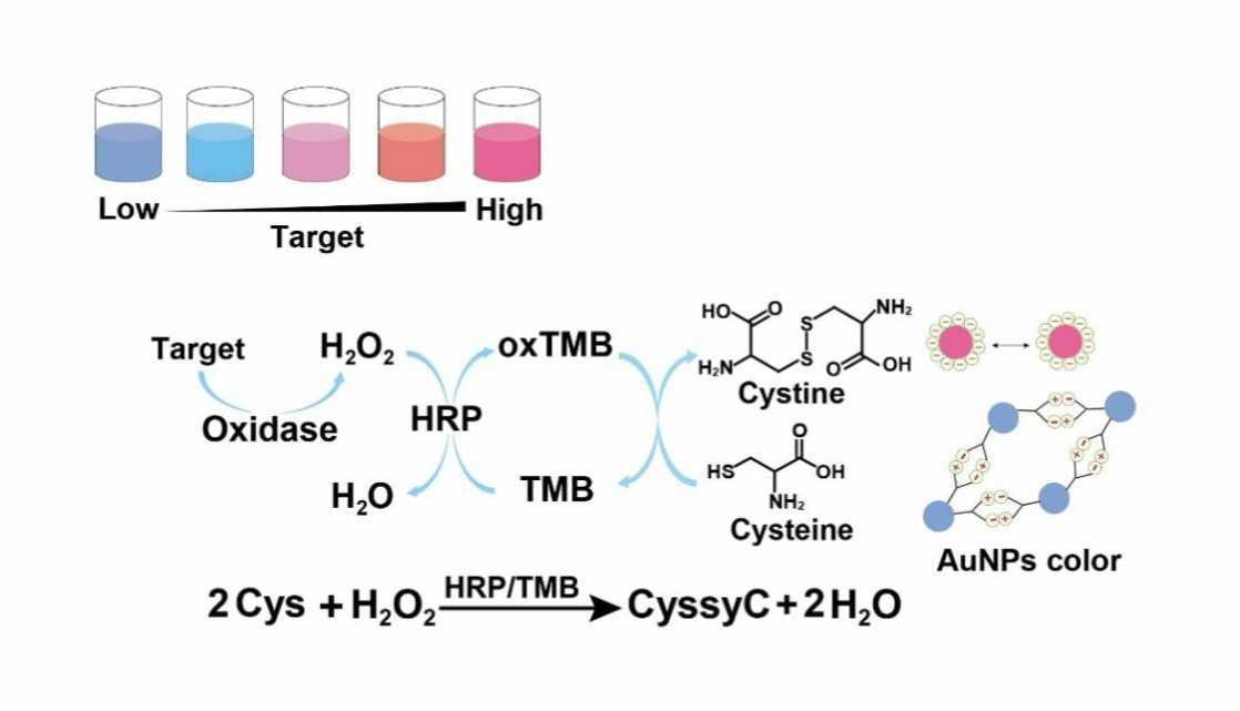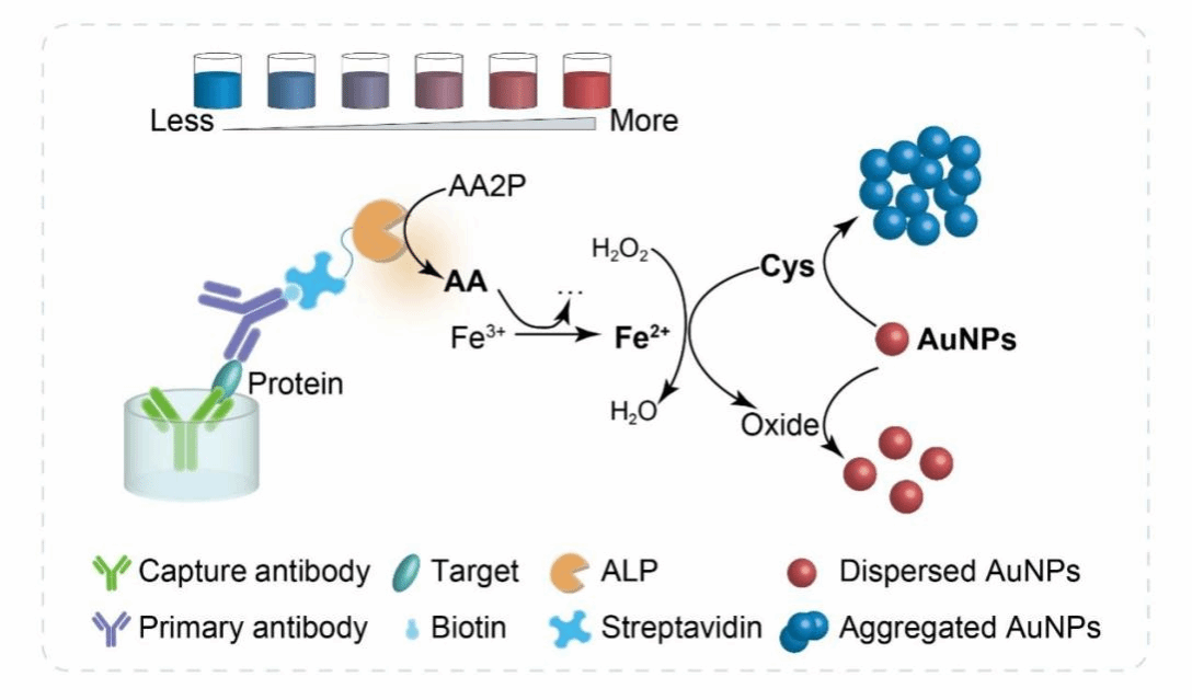 5.研究免标记等离子体传感技术用于多种小分子的可视化检测。团队研究以过氧化物酶(HRP)和TMB形成的氧化还原循环高效、特异性催化过氧化氢氧化半胱氨酸抑制金纳米团聚构建TreHOAuC平台,可免标记可视化分析H2O2含量。结合氧化酶,可拓展用于多种小分子物质(乳酸、葡萄糖和胆固醇等)检测。此外,将FeHOAuC检测技术耦合HRP,开发了等离子体ELISA检测技术,实现蛋白组分的高灵敏分析。2篇研究论文均发表于Elsevier旗下的国际分析化学领域知名期刊《Sensors and Actuators B: Chemical》(JCR 1区,影响因子8.4)(Sensors and Actuators B: Chemical, 2023, 389: 133893; Sensors and Actuators B: Chemical, 2023, 402: 135049)。