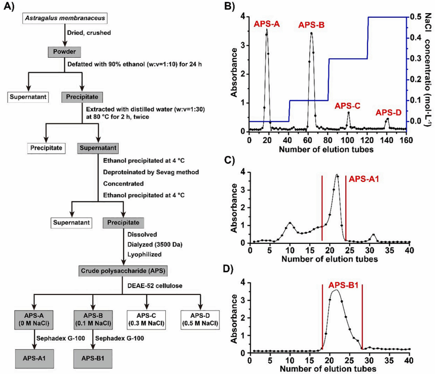 1. 结合现代检测技术揭示传统中药抗炎作用机制。首次从黄芪中分离出两种新型的均一多糖(APS-A1和APS-B1),通过HPGPC、NMR光谱等技术对二者进行结构表征。研究揭示了中药黄芪发挥抗炎活性的物质基础,研究成果发表于国际知名学术期刊《International Journal of Biological Macromolecules》(中科院1区,影响因子8.2)(Int J Biol Macromol. 2023;241:124386.)。