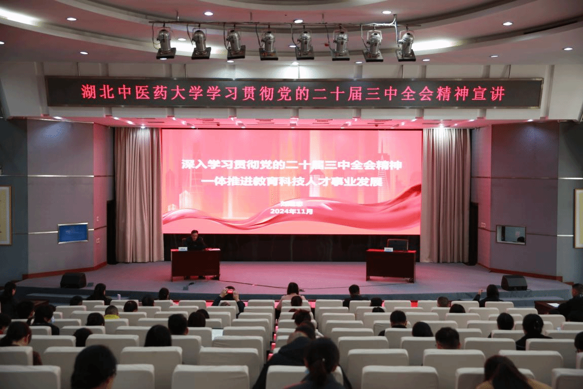 宣讲中,刘建忠从党的二十届三中全会概况、重要意义、鲜明主题、精髓要义四个方面,对党的二十届三中全会精神的丰富内涵和精神实质进行了全面系统的解读,并对习近平总书记考察湖北重要讲话精神、全国教育大会和全国科技大会精神进行了宣讲。结合分管工作,他对以改革创新精神建设高水平人才队伍引领加快高质量发展进行了详细阐述。他指出,要深入学习贯彻习近平总书记关于教育、科技创新、人才工作、中医药工作的重要论述,聚焦一流学科建设和高质量发展,以高层次人才引进培育为重点,全面提升人才队伍建设水平,服务学校“双一流”建设和高质量发展。