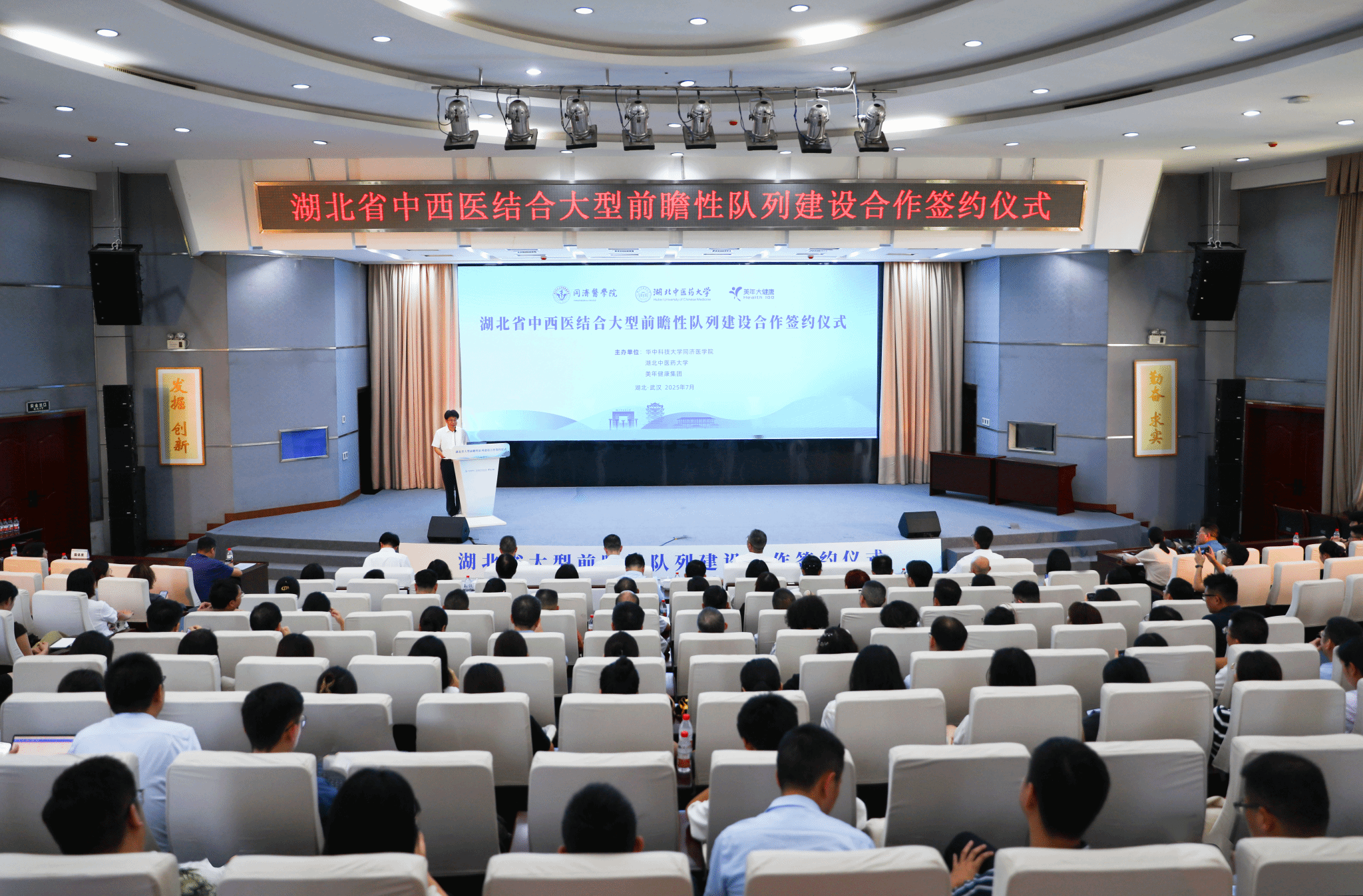 本网讯 7月30日,由华中科技大学同济医学院、湖北中医药大学、美年健康集团主办的湖北省中西医结合百万人群前瞻性队列建设合作签约仪式在学校黄家湖校区举行。中国工程院院士、华中科技大学同济医学院院长邬堂春,美年健康集团董事长俞熔,我校校长陈刚、副校长曹继刚,美年健康集团董事、中关村美年健康产业研究院院长王晓军,美年健康集团副总裁、华中大区总经理段泽彪,以及华中科技大学附属协和医院科研处、华中科技大学同济医学院公共卫生学院相关负责人,我校附属医院(湖北省中医院)及肝病研究所肥胖专科、党政办公室、科学技术发展研究院、药学院、检验学院、管理学院、信息工程学院相关负责人,来自三方单位的科研骨干、临床专家和管理团队代表等参加仪式。仪式由曹继刚主持。