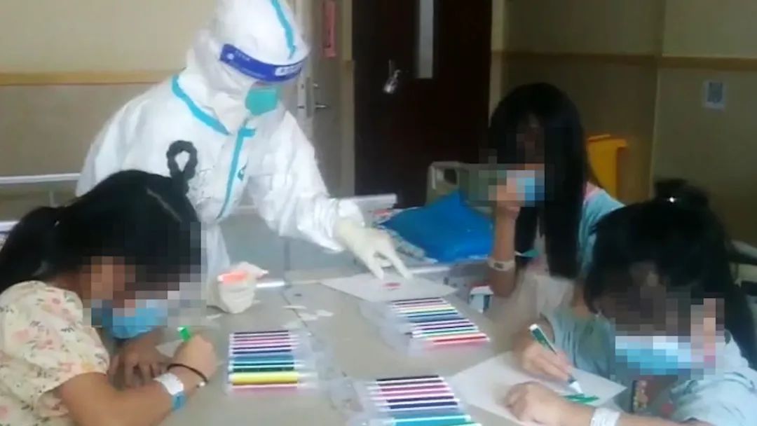 9月21日,在莆田学院附属医院肺科病房大楼隔离病房,护士与患儿一起画画(视频截图)。
