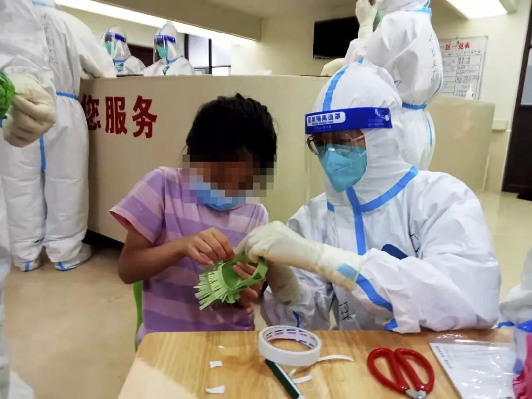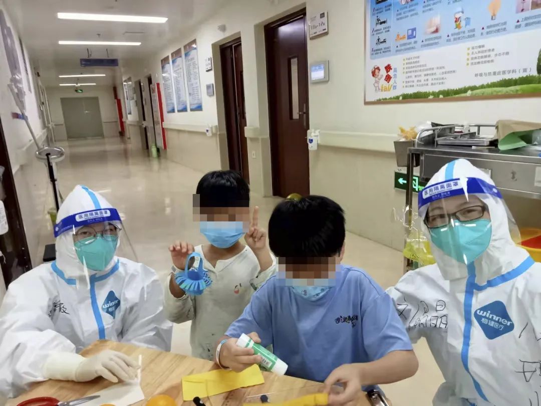 9月21日,在莆田学院附属医院肺科病房大楼隔离病房,护士与患儿一起制作灯笼。