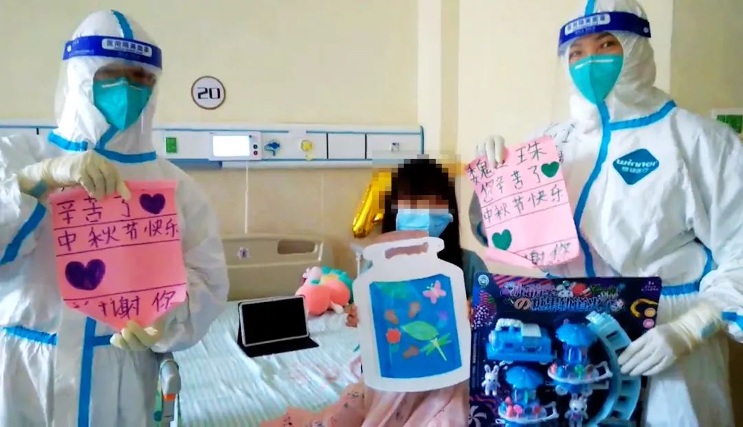 9月21日,在莆田学院附属医院肺科病房大楼隔离病房,护士与患儿互赠中秋祝福和礼物(视频截图)。