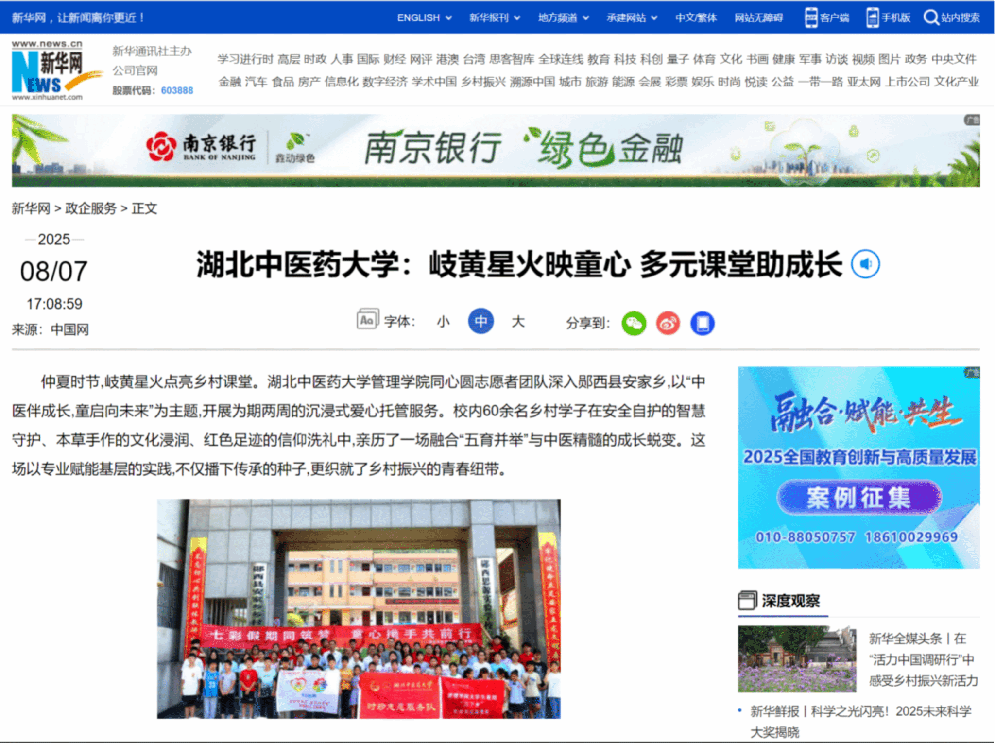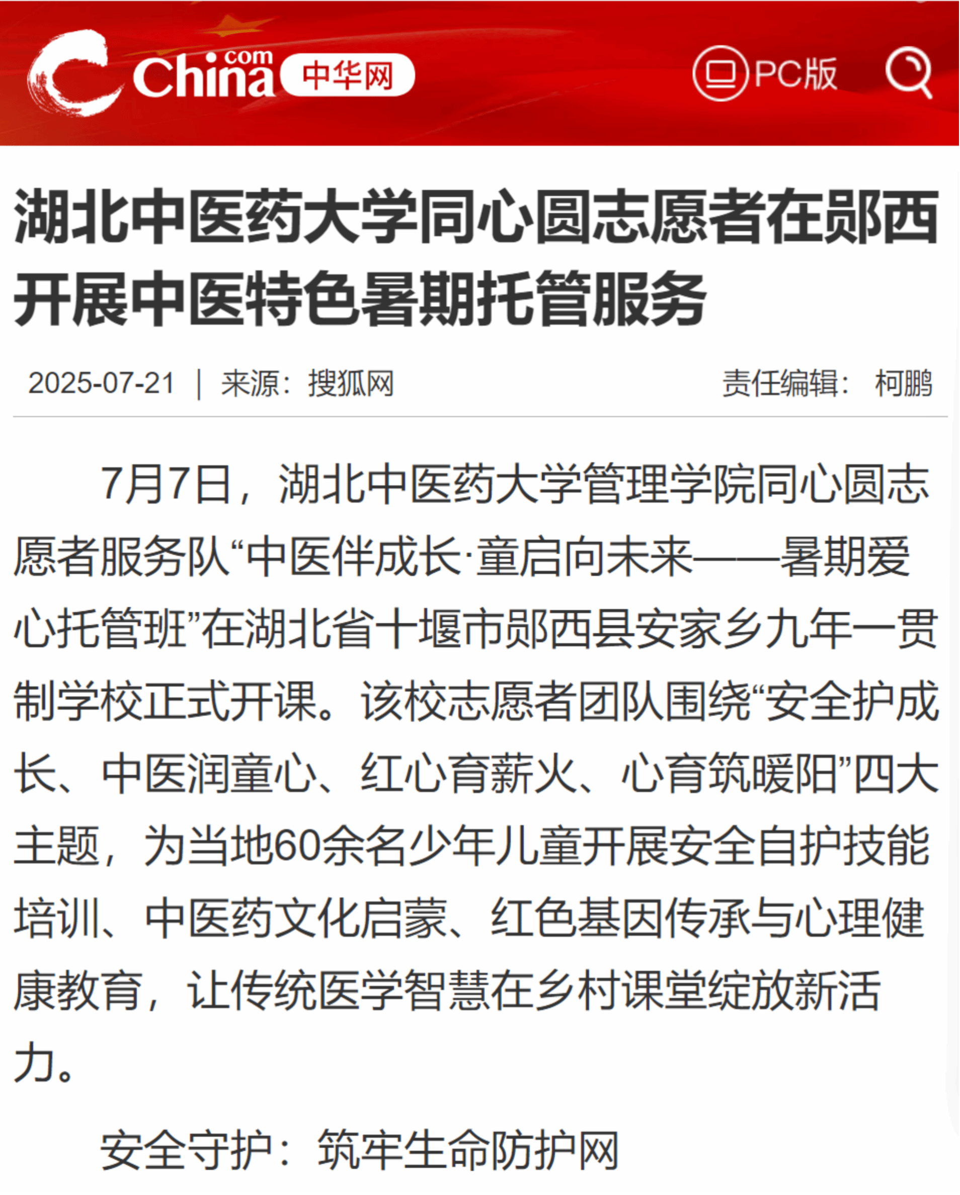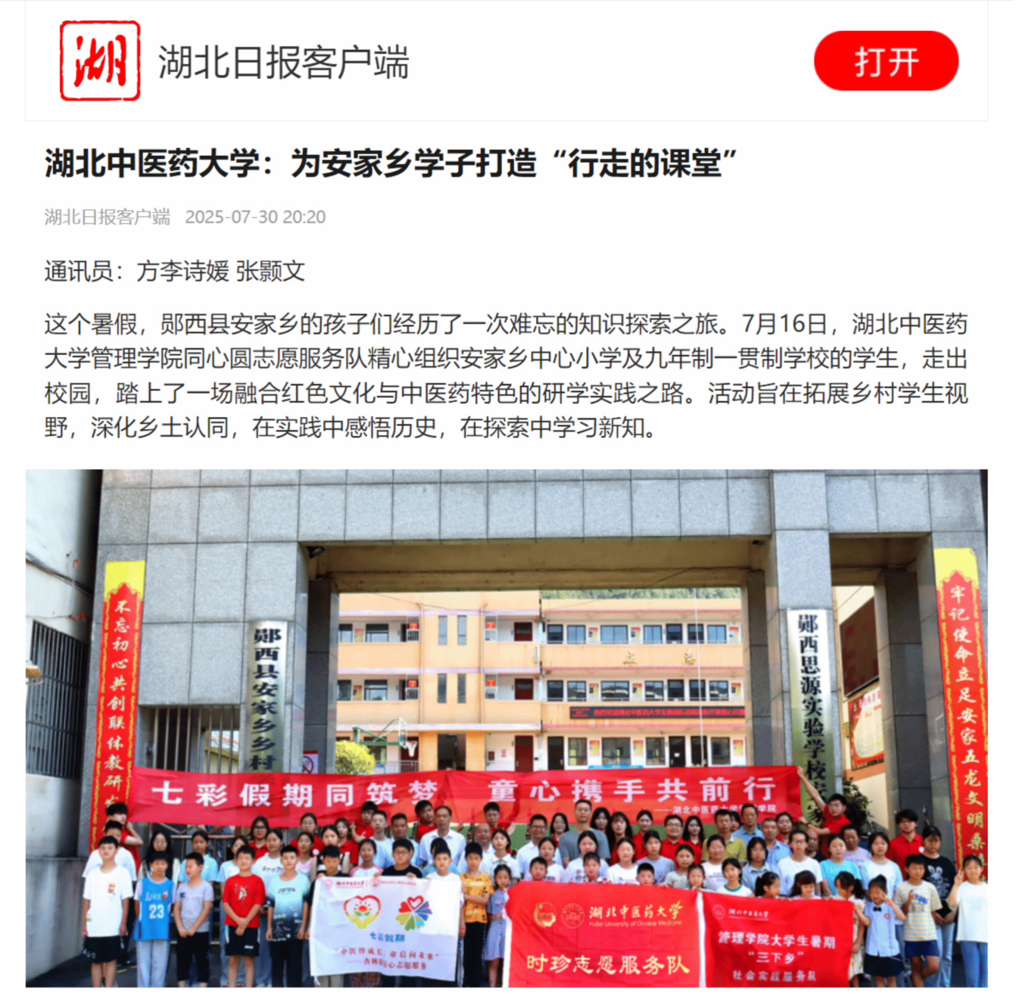 本网讯 近日,新华网、湖北日报、中华网、今日头条分别以《湖北中医药大学:岐黄星火映童心 多元课堂助成长》《湖北中医药大学:为安家乡学子打造“行走的课堂”》《“七彩假期”让乡村儿童体验航天科技与太阳能奥秘》《湖北中医药大学同心圆志愿者在郧西开展中医特色暑期托管服务》《湖北中医药大学管理学院暑期爱心托管班开班仪式在安家乡隆重举行》为题,对管理学院同心圆志愿服务队,深入郧西县安家乡,开展岐黄安康、和韵美育、杏林心育三大主题课程体系、红色研学、参观中草药种植基地等活动进行了详细报道。