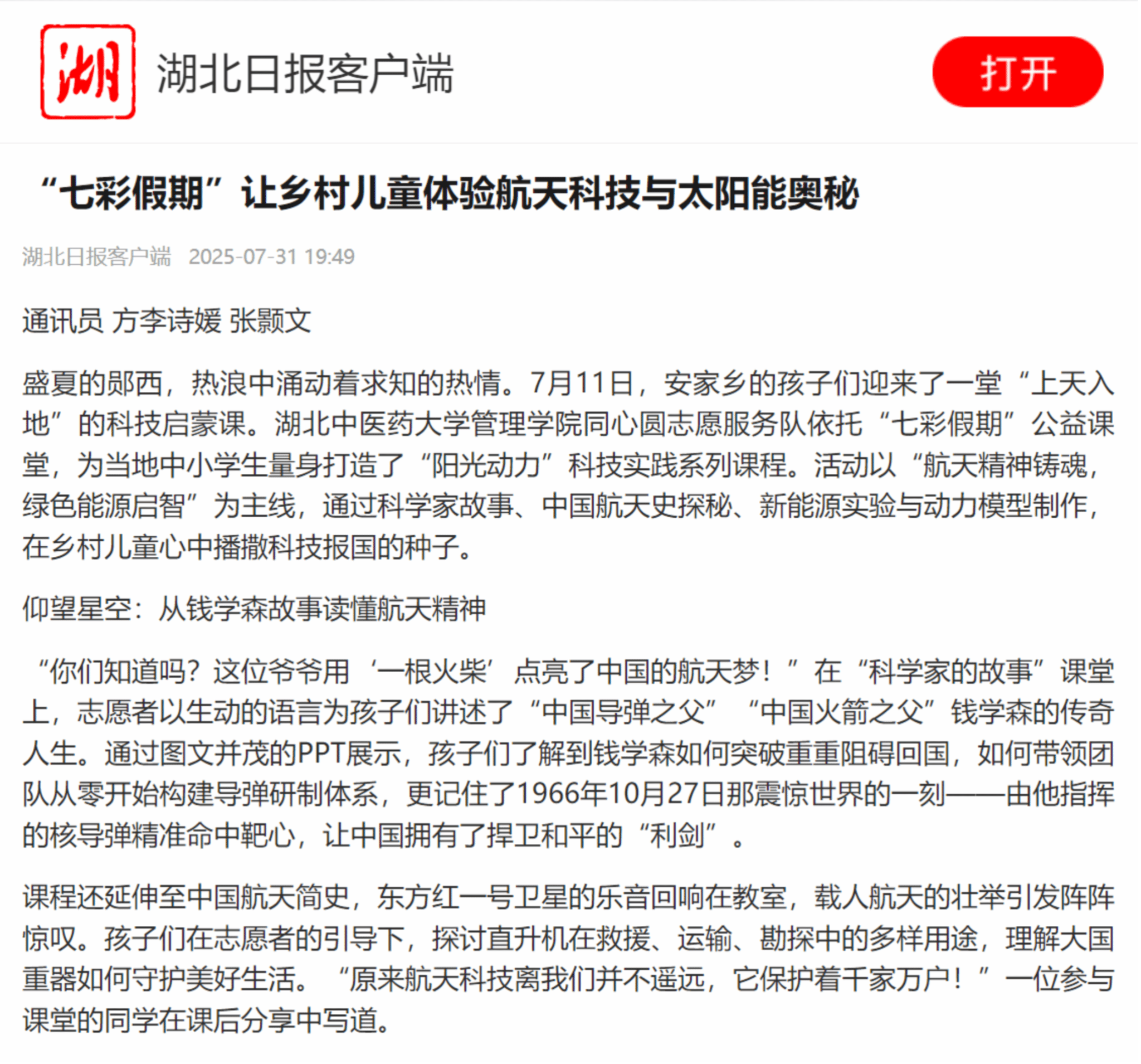 湖北日报:“七彩假期”让乡村儿童体验航天科技与太阳能奥秘