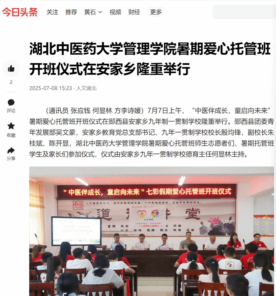 今日头条:湖北中医药大学管理学院暑期爱心托管班开班仪式在安家乡隆重举行