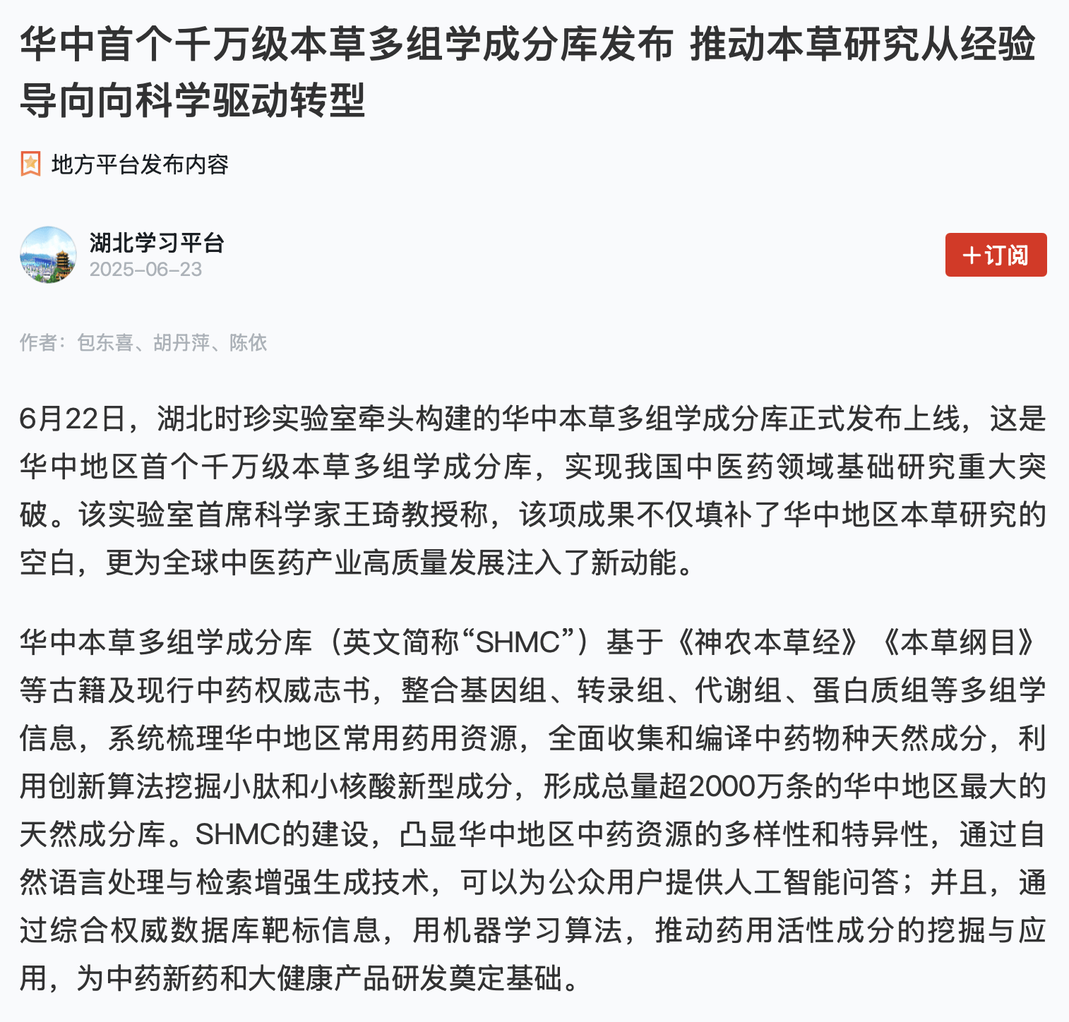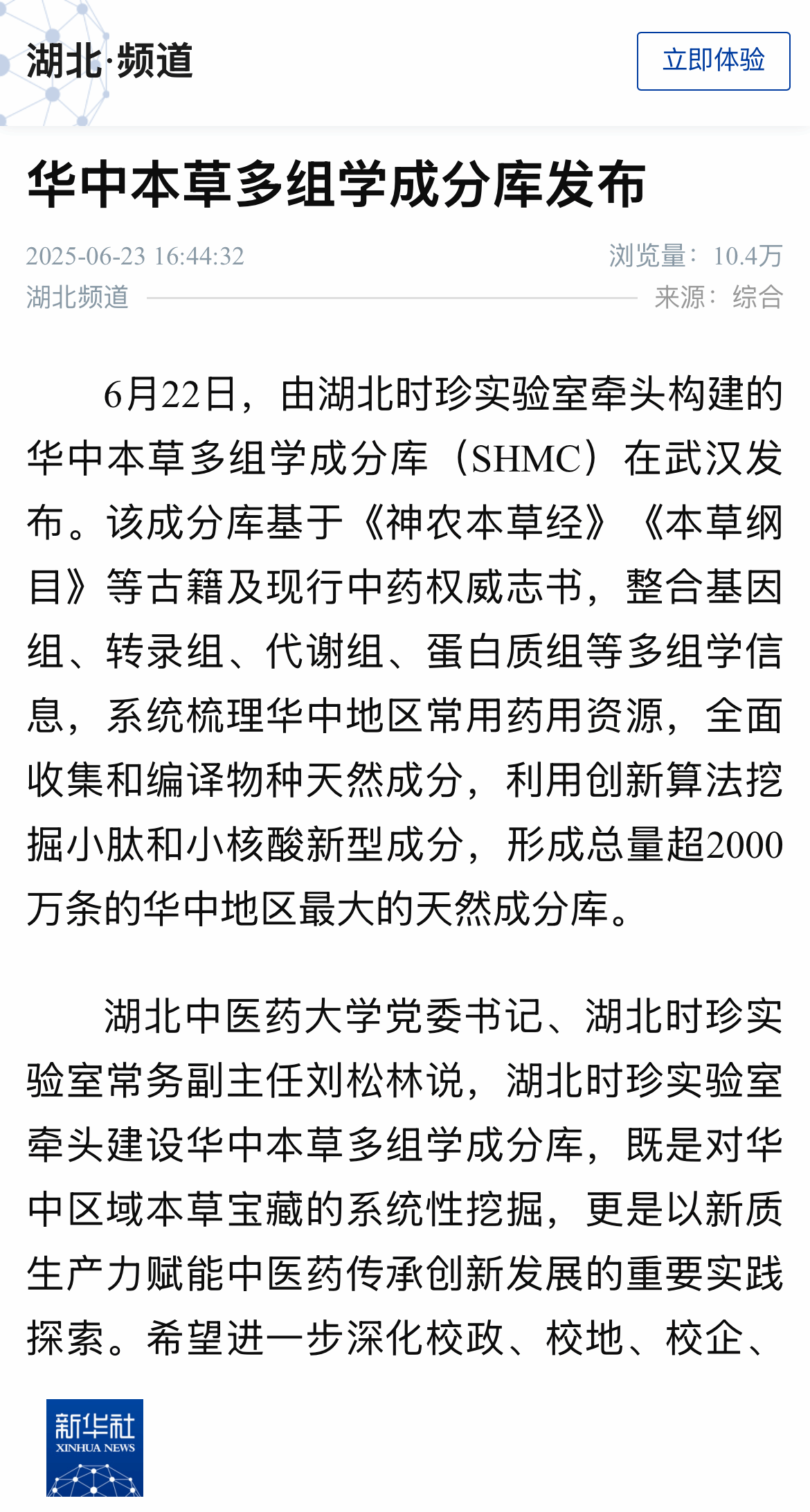 湖北日报要闻版:华中首个千万级本草多组学成分库发布