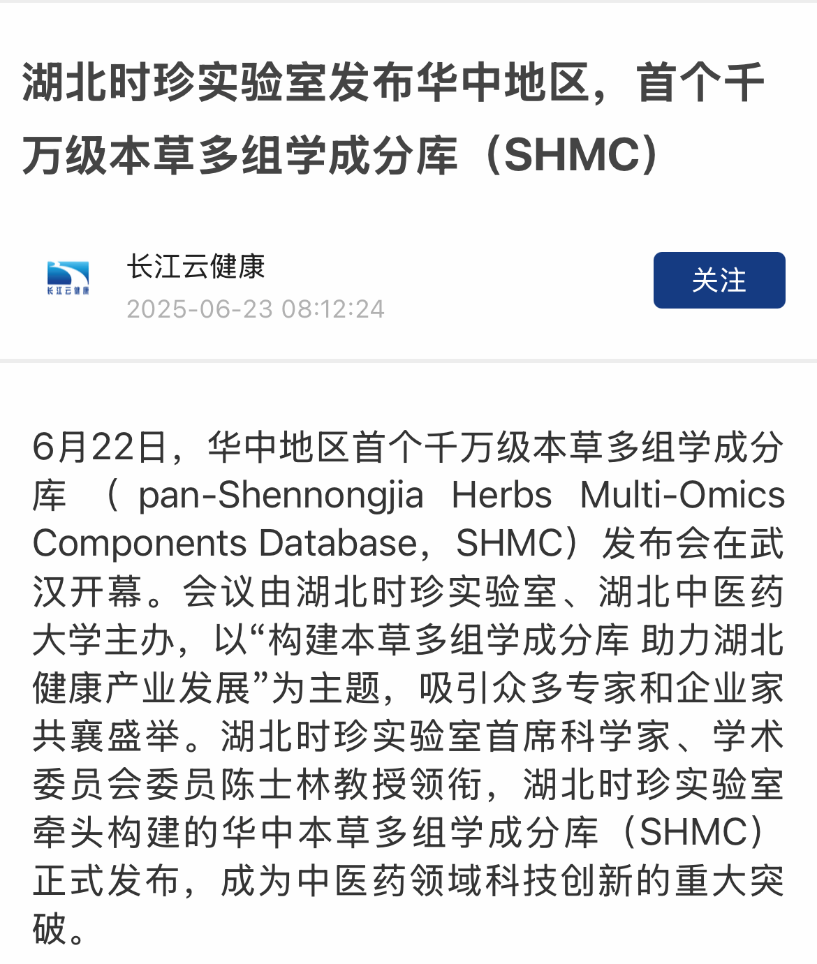 长江云健康:湖北时珍实验室发布华中地区,首个千万级本草多组学成分库(SHMC)